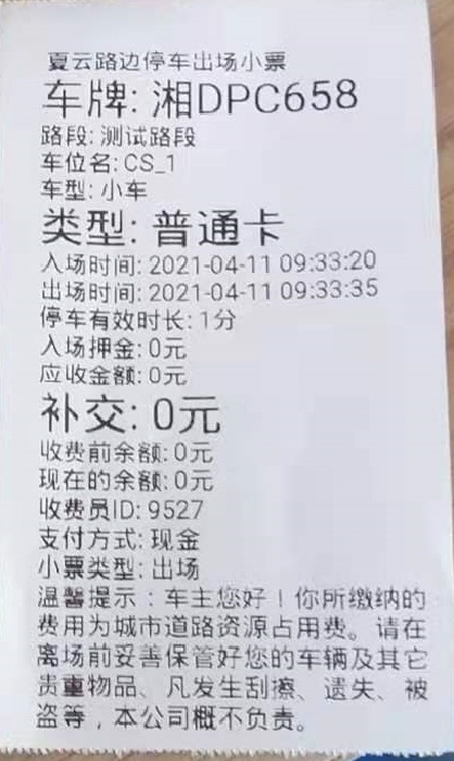 點選車位或拍照識別→確認收費結(jié)果→打印出場收費小票。