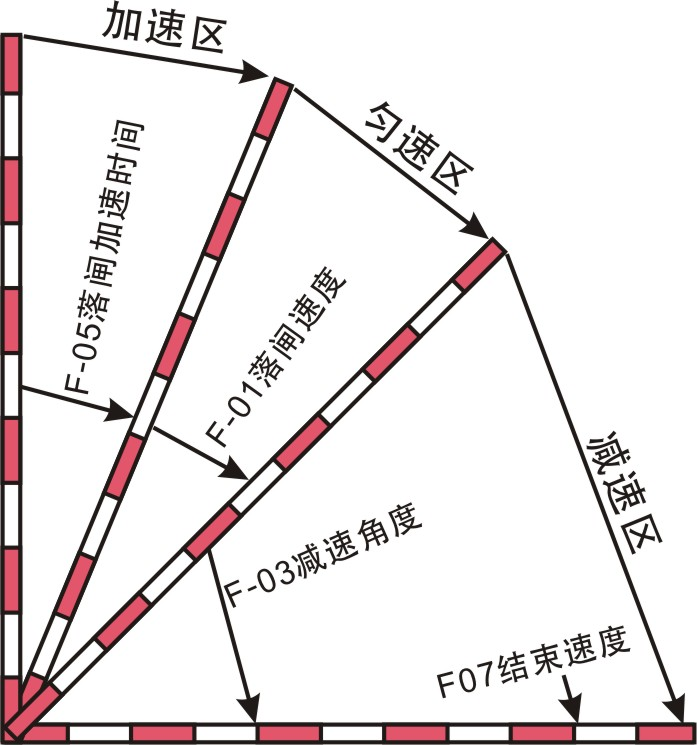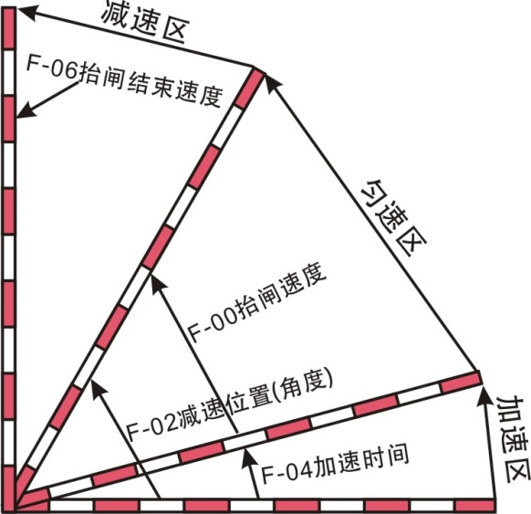 范圍:45-100,默認:90,大于等于90度或者小于等于F-02抬閘減速角度則無效。在抬閘的過程中設置了一個低速區域,當抬閘角度達到設定的角度,則以F-06抬閘結束速度運行,知道抬閘到位。