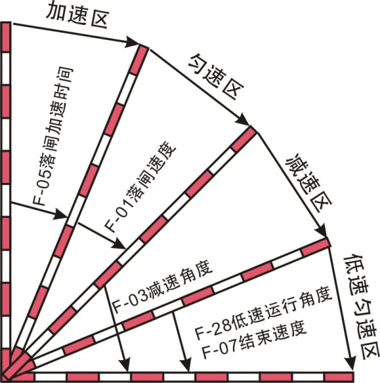 以該速度結束落閘,過小將導致關不到位,過大將導致晃動。如果F-28命令設置了落閘低速角度,并且在有效的范圍內,則在低速勻速區以該速度運行。