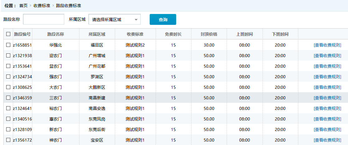 ●路段收費(fèi)標(biāo)準(zhǔn):根據(jù)系統(tǒng)添加的路段,對(duì)應(yīng)的收費(fèi)標(biāo)準(zhǔn)記錄,可點(diǎn)擊“查看收費(fèi)規(guī)則”了解收費(fèi)標(biāo)準(zhǔn)的明細(xì),每個(gè)路段可以執(zhí)行不同的收費(fèi)規(guī)則。