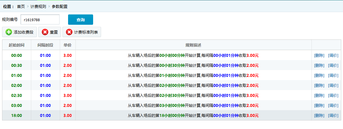 ●配置收費(fèi)規(guī)則:設(shè)置收費(fèi)標(biāo)準(zhǔn)中,按時(shí)段收費(fèi)的規(guī)則明細(xì),收費(fèi)規(guī)則信息可更改,規(guī)則明細(xì)記錄可調(diào)整。