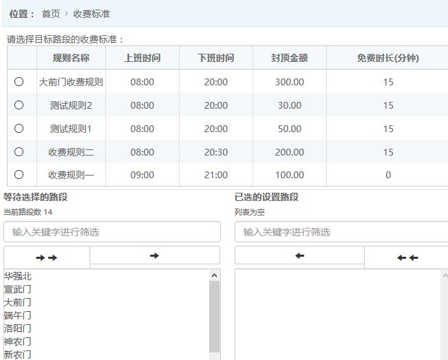 ●添加收費(fèi)規(guī)則:在列表中可選中指定的收費(fèi)標(biāo)準(zhǔn),對(duì)應(yīng)到多個(gè)路段中,如圖: