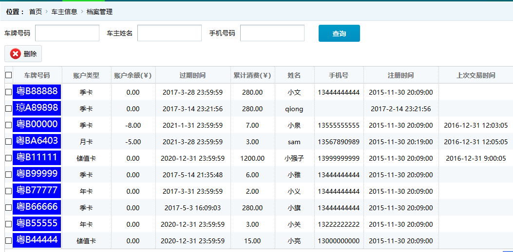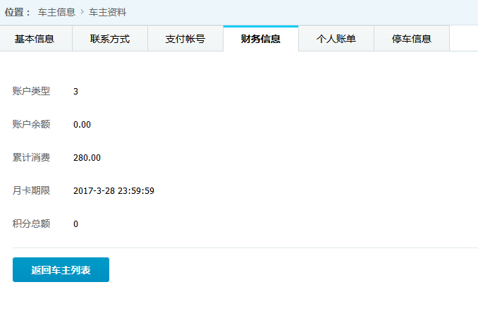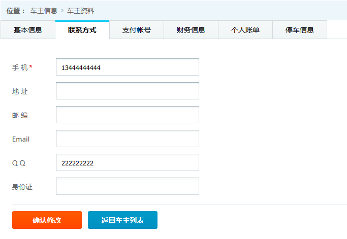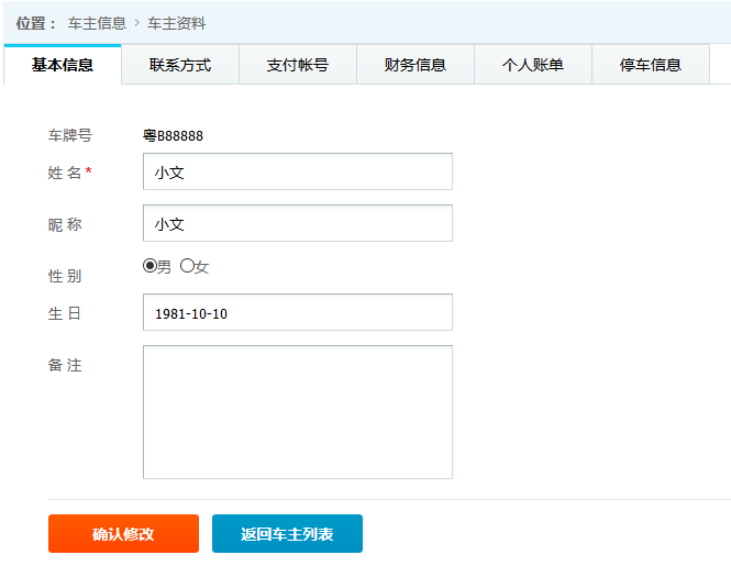 ●車主詳細(xì)信息 查看并維護(hù)車主的基本信息,旭歐科技系統(tǒng)中自動(dòng)為進(jìn)場(chǎng)停車的車輛建立會(huì)員賬戶,方便交費(fèi)充值等服務(wù)。在此功能中,管理員可對(duì)車主詳細(xì)信息查看并修改,如下圖: