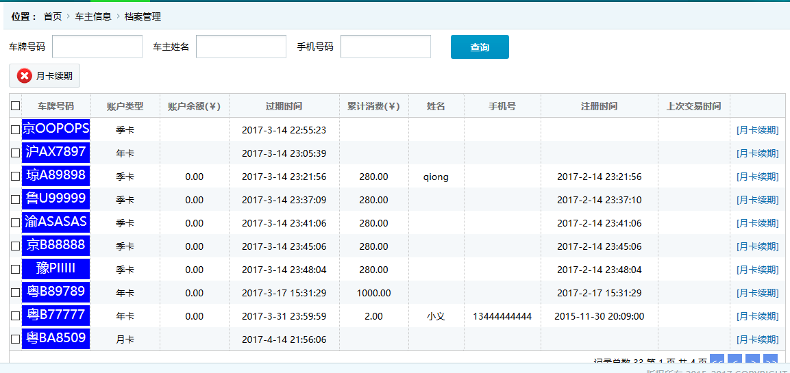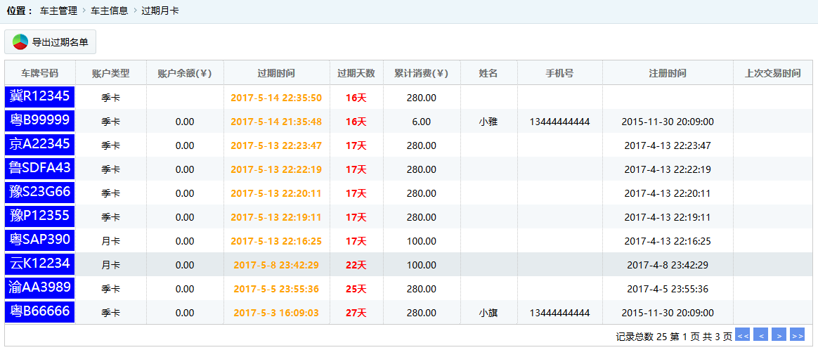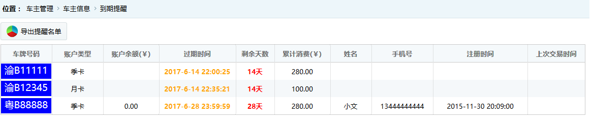 ●到期提醒 顯示月卡車主中離到期時(shí)間小于30天的賬戶信息,如圖: