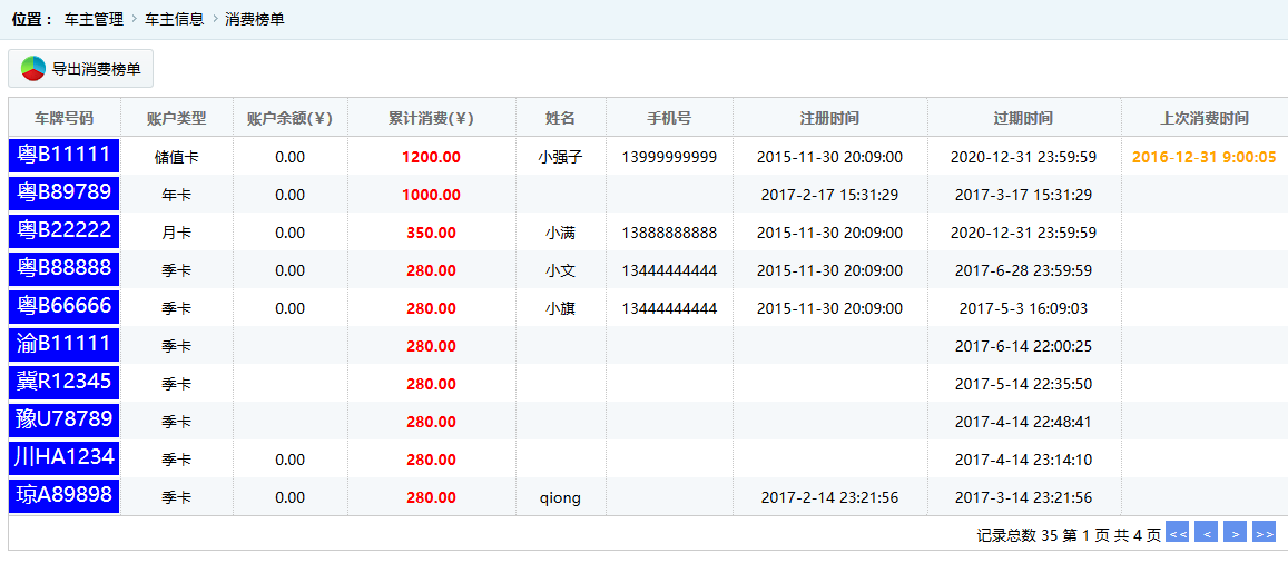 ●消費(fèi)榜單 按照累積消費(fèi)的總金額從大到小排序,默認(rèn)顯示前幾位累積消費(fèi)多的車主用戶。如圖: