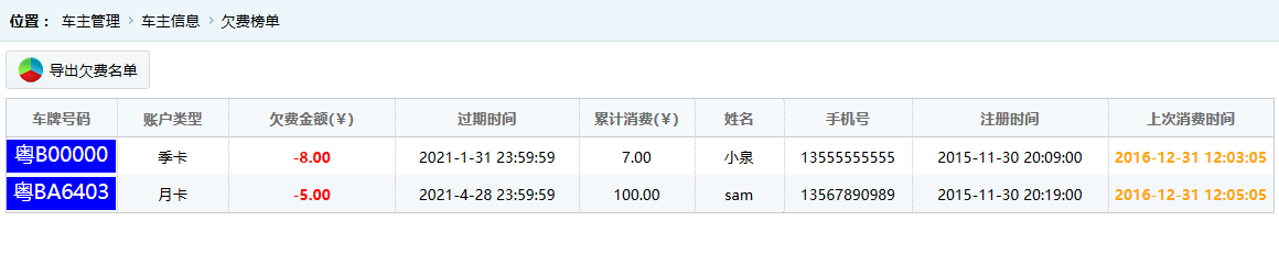 ●欠費(fèi)榜單 按照累積欠費(fèi)的總金額從大到小排序,默認(rèn)顯示前幾位累積欠費(fèi)多的車主用戶。如圖: