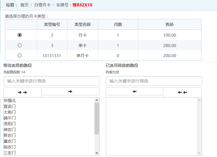 點(diǎn)擊“下一步”進(jìn)入月卡配置面板,選擇相應(yīng)的月卡類型,和支持停放的路段進(jìn)行開通。(本系統(tǒng)中支持開啟全部路段和指定路段)