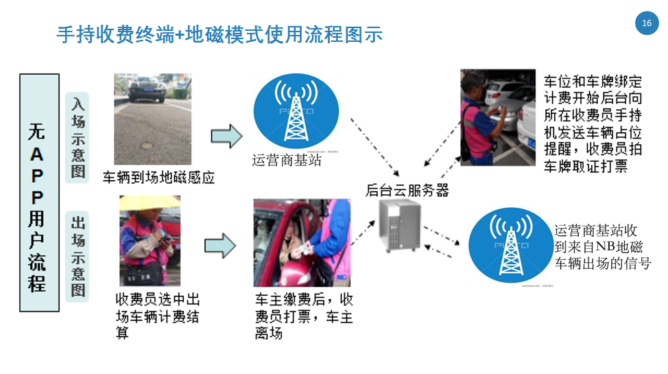 車輛入場——地磁檢測啟動——提交數據至后臺——手持端車位報警——手持機掃描車牌(錄入)——打印小票
